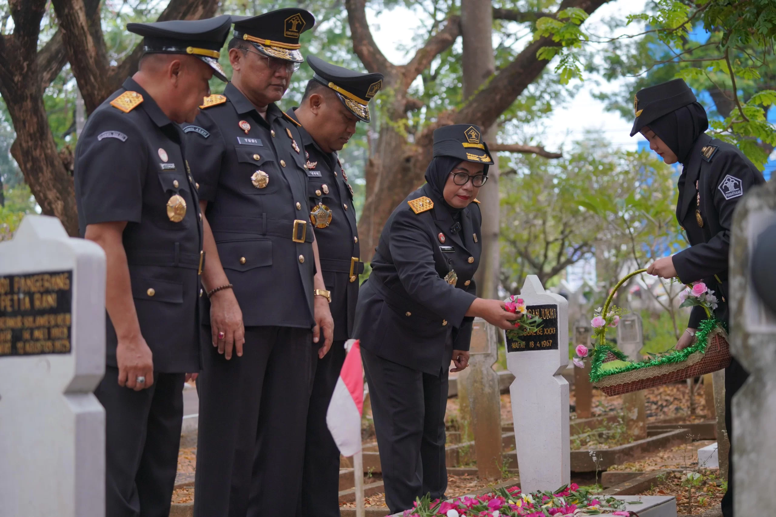 IMN, MAKASSAR – Pelaksana Tugas (Plt) Kepala Kantor Wilayah Kementerian Hukum dan HAM Sulawesi Selatan (Kakanwil Kemenkumham Sulsel), Indah Rahayuningsih didampingi Kepala Divisi (Kadiv) Keimigrasian, Jaya Saputra dan Kadiv Pemasyarakatan, Yudi Suseno Ikuti Tabur Bunga Hari Pengayoman ke-79 di Taman Makam Pahlawan (TMP) Panaikang, Jl. Urip Sumoharjo, Makassar, Sulawesi Selatan, Jumat (9/8/2024).